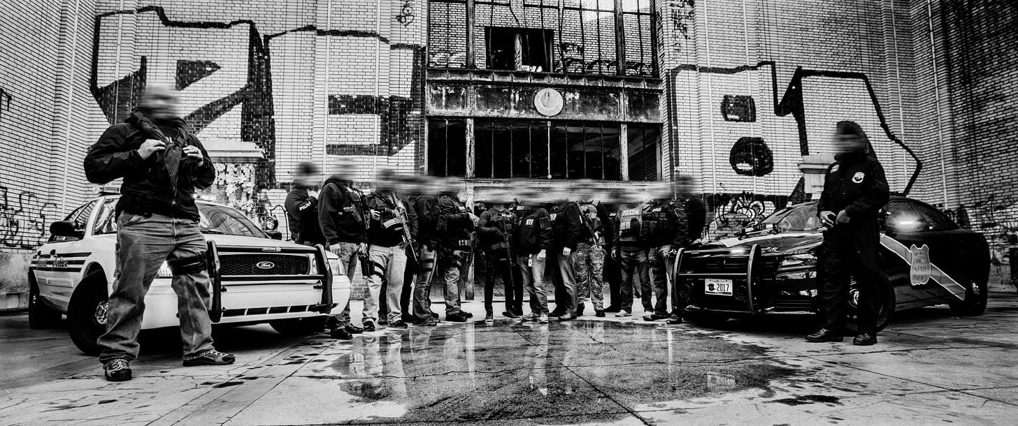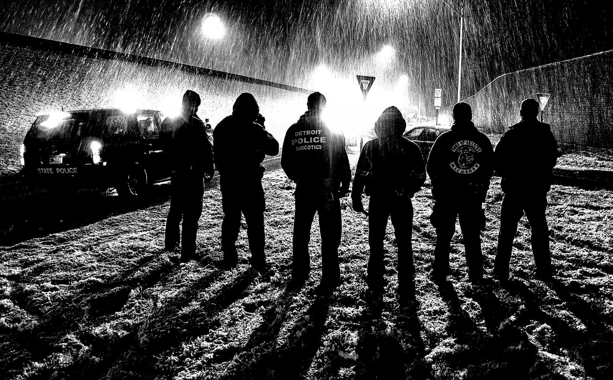 Gatekeepers were understood by Mason to be ‘used as a tool to keep Black bodies out of White spaces, unless those bodies were consuming or producing.’ The phrase he often heard as a child that described it best was ‘Don’t go across 8 Mile.’ Detroit Police Narcotics stand guard beside Sons of Anarchy Detroit in the rain. Overexposed blown-out white lights obscure unrecoverable details adding to the menacing vibe. Identities are as mysterious as the scene itself.