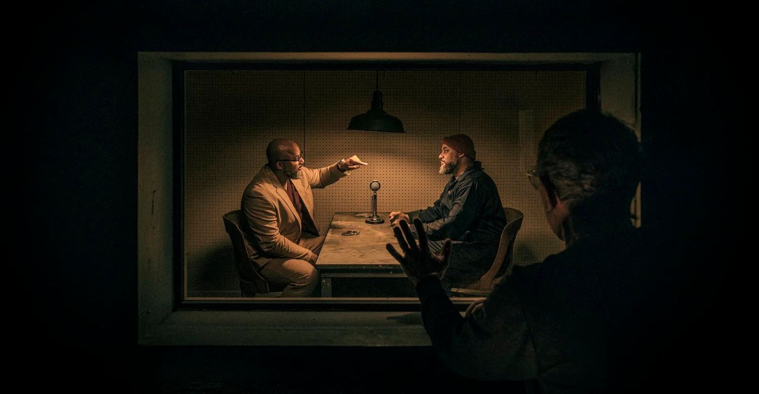 The story continues into the stationhouse where a suspect is questioned. Mason inserts himself on both sides of the table as he does in real life as a civilian and a homicide detective. Scale and perspective create the viewer a watcher along with a shadowy figure lurking behind a privacy window observing unseen.