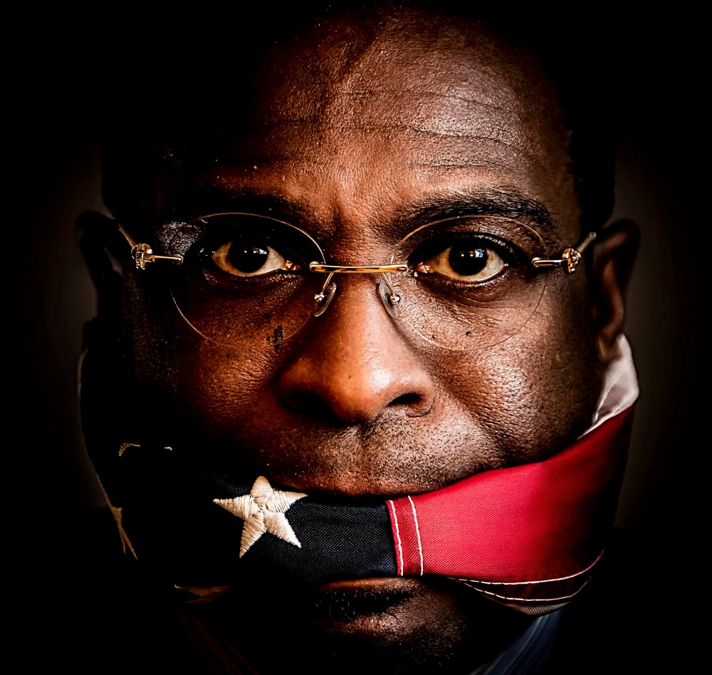 Mason’s imagery pulls no punches. His narrative is dramatic, direct and potent. The portrait’s cavernous black background weights the subject gagged by the Stars and Stripes irrespective of the man’s character. Steady eyes stare down the viewer unflinching.